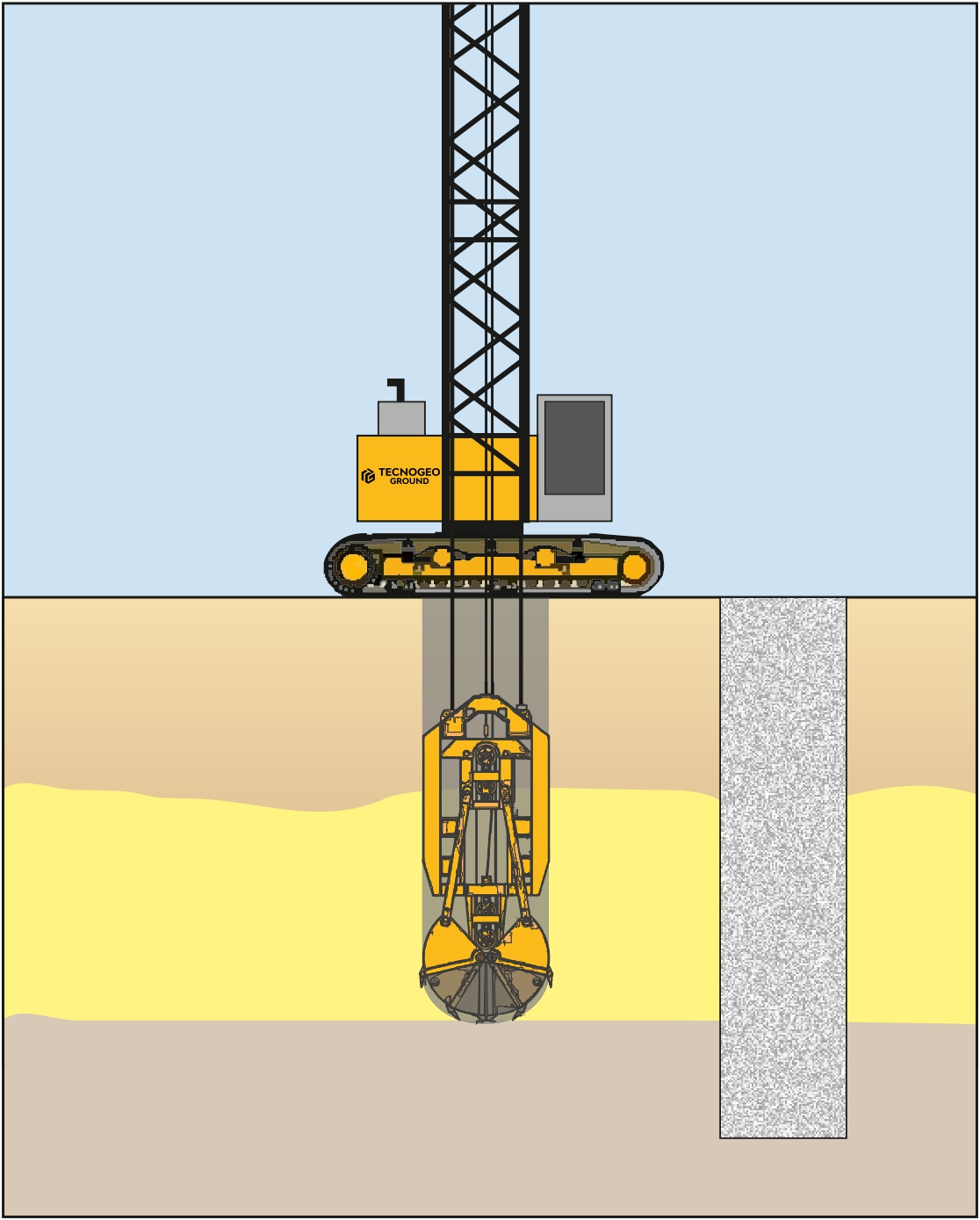 As fases são: execução da mureta-guia, escavação do terreno com clam-shell até a cota estabelecida em projeto, o preenchimento progressivo com lama bentonítica ou lama polimérica, colocação da armadura em módulos (parede estrutural) e concretagem submersa.