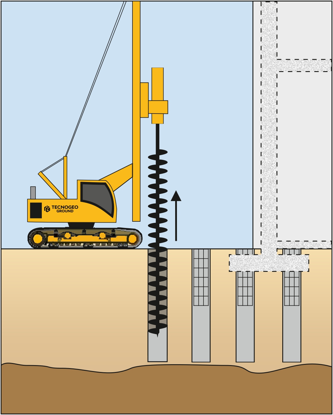 Após alcançar a cota desejada, procede-se o bombeamento controlado de concreto pelo tubo central do trado, sacando-o simultaneamente à concretagem.
